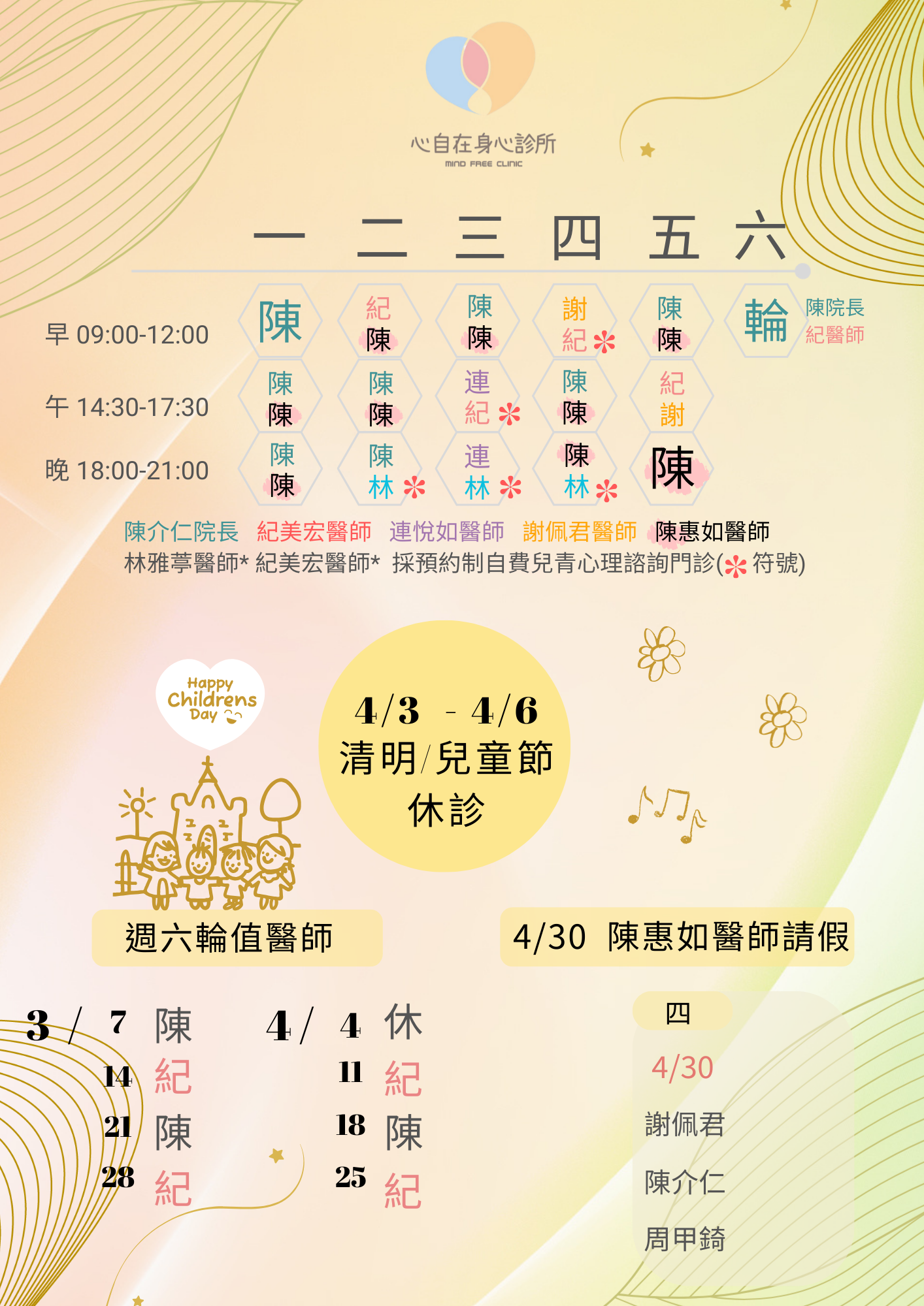 ‖ 心自在身心診所 ‖ 3、4 月門診公告